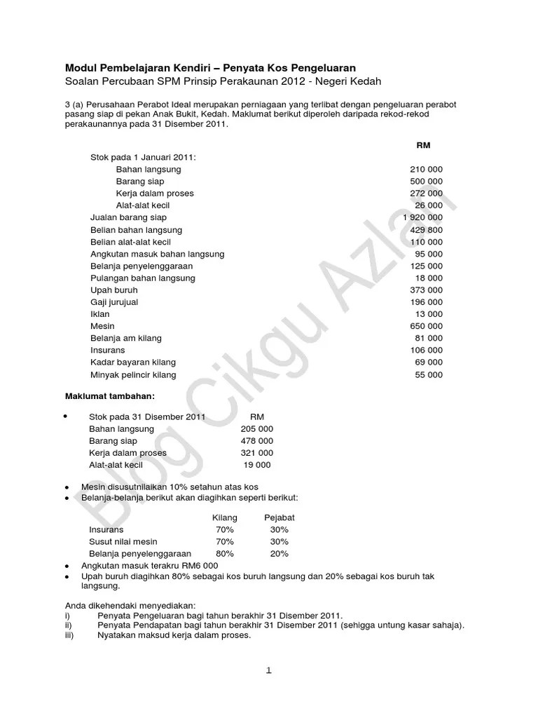 Contoh Kos Overhead Kilang / Penyata Kos Pengeluaran Pdf